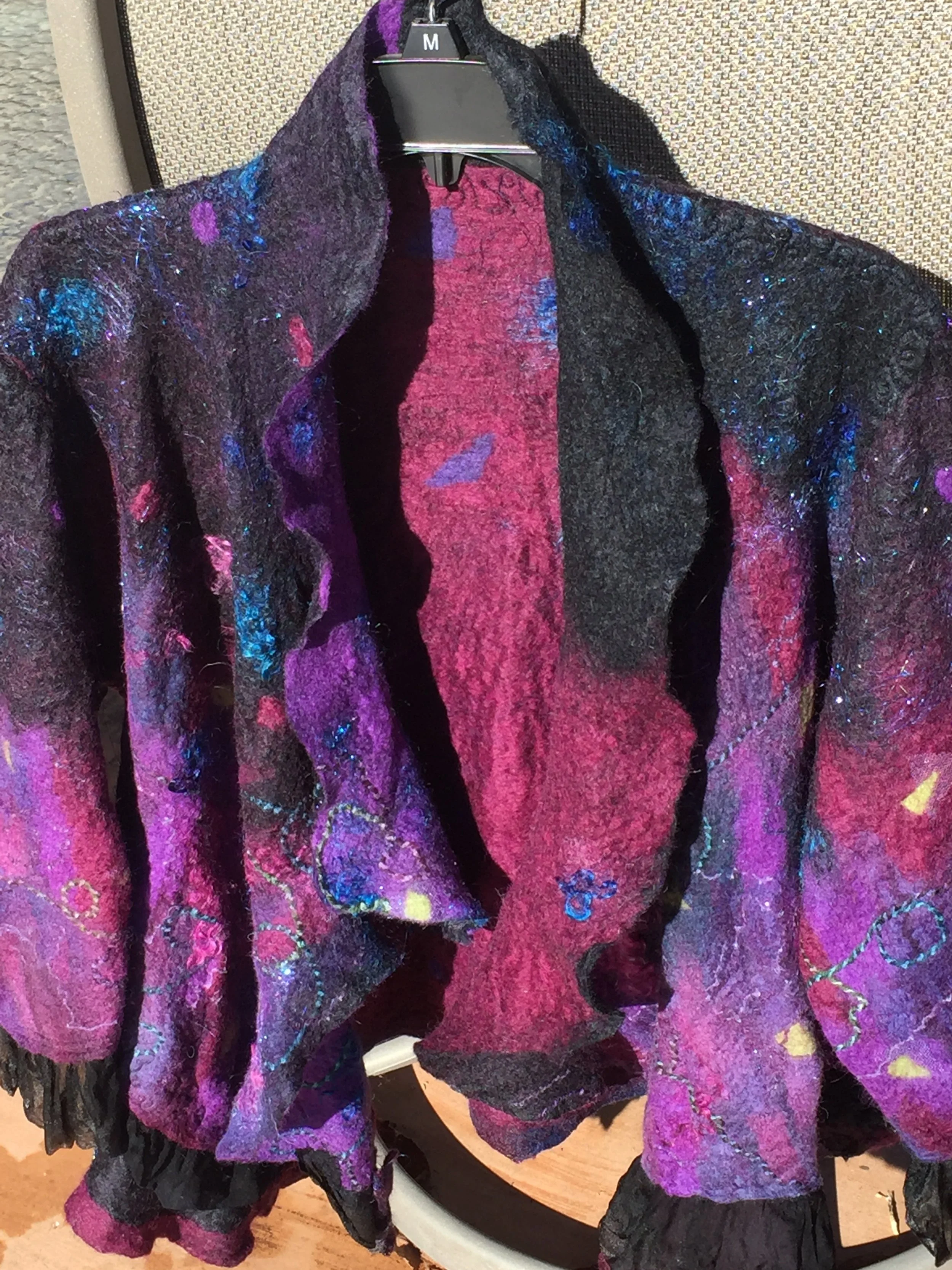 Wrap it up on a cold day! Black silk gauze with red and purple merino & silk threads.